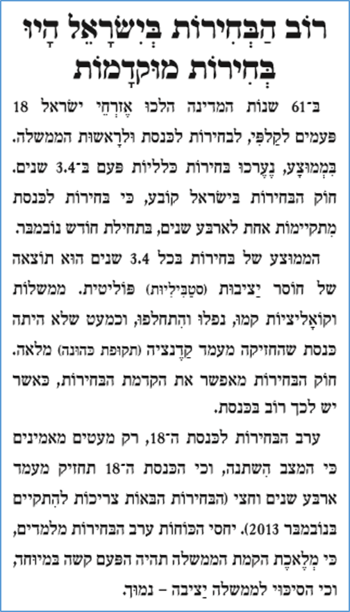 רוב הבחירות בישראל היו בחירות מוקדמות, גיליון 1529 - ט"ז בשבט תשס"ט, 10 בפברואר 2009